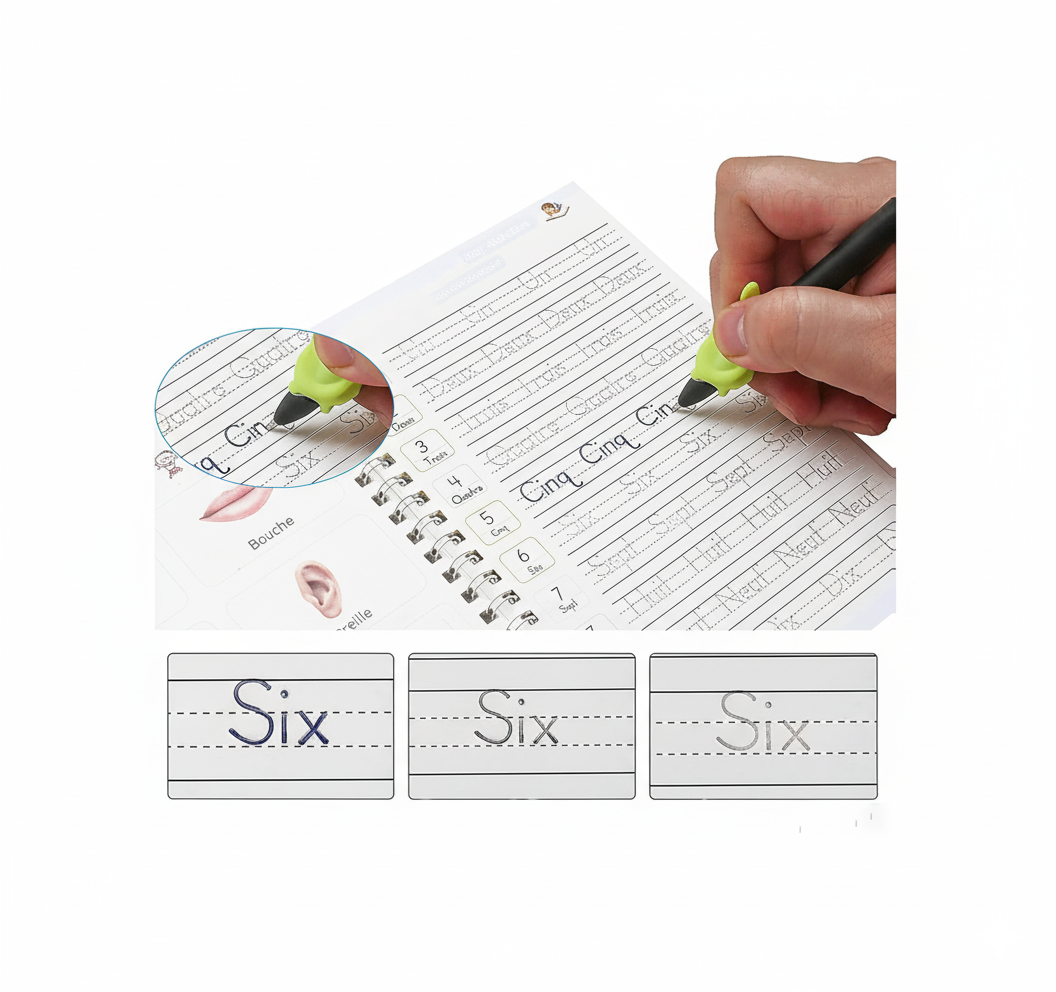 L’encre s’efface en 60 secondes pour réutiliser le cahier à l’infini, le guide-doigt aide les enfants à bien tenir leur stylo, les rainures les guident pour apprendre à écrire facilement avec des stylos rechargeables .